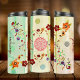 This tumbler features a captivating blend of beige, green, blue washed colours, creating a serene backdrop that evokes a sense of tranquillity and relaxation. Adorned with watercolor flowers in rich burgundy, fiery orange, sunny yellow, and earthy neutral tones, with green leaves in varying shades, this design exudes an eclectic vibe that's both captivating and comforting.