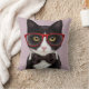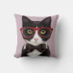 Design of a hipster style tuxedo cat wearing red specs and black bowtie on purple background. Digital illustration by Maryline Cazenave.