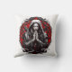 White and black on facing sides. The image depicts a figure that combines elements of mysticism and gothic art, featuring a central character with a serene yet intense expression. The figure appears to be a woman dressed in a hooded robe. Her skin is pale, almost white, giving her an ethereal appearance. She has her hands clasped together in a prayer-like gesture, emphasizing a sense of contemplation or ritual. The woman's face is highly stylized, with a white base and red markings. A small red dot is present on her forehead, and additional red lines are below her eyes, which adds to the mystical aura.
