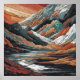 A surreal mountainous landscape with a winding river under an orange sky, featuring rocks in earthy, white, and bluish tones, and a rich, vibrant colour palette.