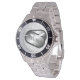 Has heft and feel of expensive stainless steel quartz watches. Good band with safety catch. I removed links, which is easy because engraved arrows show direction to push the linking pins. As always by this seller, the image (a railroad logo) is a perfect reproduction of my emailed image, and is precisely spaced and aligned.