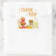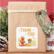 Add a festive touch to your fall celebration with this adorable thank you sticker featuring Elmo dressed in a cheerful jack-o'-lantern pumpkin costume. Set against a white background with scattered colourful autumn leaves, Elmo is surrounded by seasonal harvest details like pumpkins, hay bales, corn stalks, and a wooden basket filled with orange flowers. Bold orange “Thank You!” text makes this the perfect sticker for sealing favour bags, cards, or party treats at a fall-themed birthday celebration.