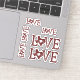 Distressed western lettering of the word "LOVE" with the "O" replaced by the state of Texas with a heart cut out of it. Available in U T Longhorns burnt orange, Texas A & M Aggies maroon, Tech Raiders red, black, state flag blue, cactus green and periwinkle purple. On the extra-small sheet, the large sticker is about 2" wide, the small stickers 1" wide.