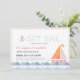 This cute and modern "Set Sail" birthday invitation features a pink sailboat on blue waves on a white background framed by a blush pink border. The reverse side features a blush pink background with white stripes. Personalise for your needs. You can find more matching products at my store.