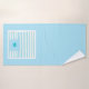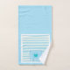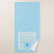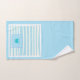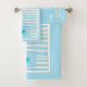 Set tre asciugamani bagno,fondo celeste con disegno righe e logo appartamento per vacanze.
