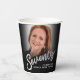 Seventy silver coloured style effect script text on black paper cups. Personalise these cups with two photos of your birthday girl turning 70, one on each side (for past and present plus add your own name or message. Ideal for a 70th birthday party or surprise half century event. Other years and matching items are available. © Original design by Sarah Trett for www.mylittleeden.com on Zazzle.