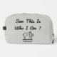 Toiletries Dopp Kit Tote Bag all over print style fashion statement accessory printed with Sew This Is Who I Am ? creative word text phrase pun question mark and sewing machine graphic with the most popular classic Christmas theme colours design illustration by TheFabricSeal print on demand shop at Zazzle.com #ZazzleMade https://www.zazzle.com/store/thefabricseal TheFabricSeal©️Original.