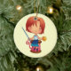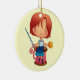 A double sided ornament featuring a cute cartoon girl with red hair, sitting on top of a giant reel of pink cotton, holding a needle and a yellow button with 4 holes.