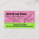 2-tone color scheme on this business card featuring a simple needle and thread with decorative swatches for a seamstress, quilter or quilting products, sewing projects and custom alterations.