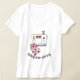 Ladies tee shirt with whimsical cartoon graphics of a sewing machine and a quilt. Black text reads Itching to be stitching and can be personalised to read what you want.