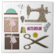 A collage of sewing themed stickers. Sewing maching, fabric, scissors, thread, buttons and pin cushion.