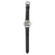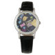 Round face watch with leather strap, Black background and colourful sewing notions. Great idea for her to keep trace of time while sewing in her craft room.