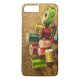 This colourful iPhone 8/7 Plus case displays the tools of the seamstress. Bright spools of thread in rainbow colours of green, red, pink, turquoise, yellow, gold, blue and orange stand beside a measuring tape, thimble, buttons and pins. All are set on an image of a brown burlap pattern background.