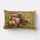 This colourful lumbar pillow displays the tools of the seamstress. Bright spools of thread in rainbow colours of green, red, pink, turquoise, yellow, gold, blue and orange stand beside a measuring tape, thimble, buttons and pins. All are set on an image of a brown burlap pattern background.
