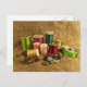This colourful postcard displays the tools of the seamstress. Bright spools of thread in rainbow colours of green, red, pink, turquoise, yellow, gold, blue and orange stand beside a measuring tape, thimble, buttons and pins. All are set on an image of a brown burlap pattern background.