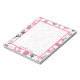 A notepad featuring a sewing themed design consisting of a sewing machine, spools of thread, a pin cushion, scissors, fabric swatches, and sewing needles. Design has a pink colour scheme.