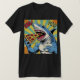 This T-shirt features a bold, colourful graphic of a muscular shark enjoying a slice of pepperoni pizza in a fun, cartoonish style. The design has a comic-book vibe, with vibrant rays in the background and words "SHA!" and "PIZZ!" in playful, dynamic lettering. The shark, drawn with exaggerated features, is posed as if relishing the pizza, adding a humourous twist. The shirt's dark base colour makes the bright illustration pop, making it a great choice for anyone with a quirky sense of humour or a love for both sharks and pizza.