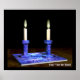 A digital rendering of lit Shabbat candles; the candlesticks and tile upon which they rest feature a fractal pattern. Add your own text. On Shabbat (The Sabbath - Saturday) Jews observe the commandment of a day of complete rest. Genesis describes how God, after creating the Heavens and the Earth in six days, rested on the seventh. Like all Jewish days, Shabbat begins at sunset, because Genesis Ch. 1 reads, "And there was evening, and there was morning, one day." From this, we infer that a day begins with evening, that is, sunset. Shabbat candles are lit and a blessing is recited no later than eighteen minutes before sunset. This ritual, performed by the woman of the house, officially marks the beginning of the Sabbath. The blessing is as follows: Baruch a-ta A-do-nay Elo-hei-nu me-lech ha-o-lam a-sher ki-dee-sha-nu bi-mitz-vo-tav vi-tzi-va-noo li-had-leek ner shel Sha-bbat Translation: Blessed are You, Lord our God, Ruler of the Universe, who has sanctified us with commandments, and commanded us to light Shabbat candles.