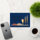 Shabbat Shalom dinner invitation in beautiful blue with elegant gold foil script above a lovely Shabbat dinner with challah bread, wine, and candles. May you have many blessings. Personalise the back with your Jewish supper invite details.