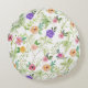 This Shabby Chic Floral round pillow has pink flowers, yellow flowers, purple flowers, and red flowers on a field of green leaves.