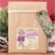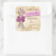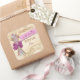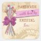 Shabby chic style knitting needles in a big, girlie pinkish bow with aged lacey background on this "handmade with love" sticker for knitters and knitted goods.