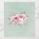 Pretty and feminine shabby chic design features large bouquet of pink roses and other florals with rose gold leaves on background of distressed mint and pale pink stripes. Pretty for all types of parties and get togethers from fancy teas to wedding receptions.