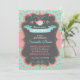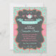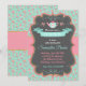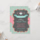 Vintage inspired shabby chic tea party invitation. With a teal background covered in pink roses and the bottom is contrasting with pink and white stripes and separated with a pink ribbon with white stitching. With a lovely scalloped frame to hold all your party information that is finished off with a pink tea pot at the top.