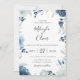 Watercolor garden flowers in chic and trendy shades of navy, light pastel and dusty blue with soft botanical branches, wedding invitation. Back of card features solid coordinating dark blue colour. Customise text, font style, colour and size.