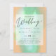 Modern wedding invitation featuring text template fields on both sides and a cloud of greeny blue colour.