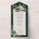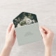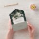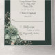 This enchanting All in One wedding invitation beautifully captures the essence of nature with its stunning floral design in shades of green on a serene dark green background. This invitation suite is the perfect choice for couples seeking an elegant and romantic touch to their special day. The All-in-One wedding invitations are both beautiful and practical by combining the wedding invitation with an easy to remove perforated RSVP postcard. They are also quick and easy to prepare for mailing. Simply address the invitation, fold the back flap and seal with the included clear stickers. Once your guests receive the pre-addressed invitation they simply tear off the perforated RSVP card and drop it in the mail.