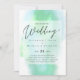 Modern wedding invitation featuring text template fields on both sides and a cloud of greeny blue colour.