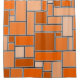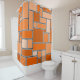 This shower curtain has a Bauhaus design of various sized rectangles in various shades of orange on a field of black.