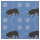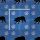 A shadow silhouette Border Collie rough in classic position with a blue background decorated with paw prints and tracks in shades of grey, pink and blue. Design by Diane Blackman. The same design is available with other fun dog images.