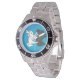 Has heft and feel of expensive stainless steel quartz watches. Good band with safety catch. I removed links, which is easy because engraved arrows show direction to push the linking pins. As always by this seller, the image (a railroad logo) is a perfect reproduction of my emailed image, and is precisely spaced and aligned.