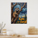 This atmospheric painting features a racoon with its striking facial mask, clinging to a branch in a dimly lit tree. The background is a moody blend of dark blues and greys, with a touch of ethereal light filtering through. The text "CUTE BUT FERAL" stands out in white, bold letters at the bottom, emphasizing the contrast between the animal's appearance and its wild spirit.