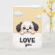 This card shows a cute cartoon puppy with a fluffy white-and-black head peeking over the top of a white banner. Its little paws rest on the banner edge, and it looks straight at you with big brown eyes, a happy open smile, and light pink blush on its cheeks 🥰. Behind the puppy is a soft pastel yellow sky with a few puffy light-blue clouds floating around. The banner curves gently across the lower part of the design, like the puppy is proudly holding it up for you to read. On the banner, the words “LOVE you” appear in two lines, with “LOVE” in black uppercase letters and “you” in a smooth, cursive-style black word right underneath. The simple scene feels sweet and caring, like a small reminder that someone is thinking of you. It’s a meaningful card to give because the puppy’s joyful face makes the message feel friendly, warm, and easy to believe ❤️.