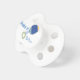Whimsical baby pacifier done in white, with graphics of a a blue, green, purple and yellow baby rattle. Blue fun text reads Shake it Baby. Matching Shake Rattle and Roll products available.