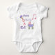 Whimsical baby girl's bodysuit done in a cute Rock and Roll theme, with graphics of musical notes, a rattle and baby carriage. Text reads Shake Rattle & Roll. Chose size and colour you like best. Great baby shower gift idea, matching products available.