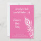 A large peacock feather in white decorates this Hens Party Invitation on a pink background with the cute saying, Get Ready to Shake your Tail Feathers! making it perfect for a night on the town dancing to celebrate the bride.
