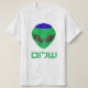 Green alien head with big eyes wearing a kippah/ yarmulke with "Shalom" in Hebrew below.