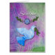 Shalom for Pesach, Dove, Magen David, and Olive Branch. Paper greeting card for Pesach / Passover. Illustration of a dove covered with watercolors, olive branch, and Magen David / Star of David all on a background of faux textured violets, blues, and greens. Original design, image and verse copyright © Shoaff Ballanger Studios.