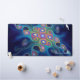 A multicolored (pink, green, blue, yellow), looping fractal image on a dark blue background. An interpretation of how the night sky may appear to a Siberian shaman while in a trance communicating with the spirits. Add your own text.