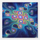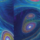 A multicolored (pink, green, blue, yellow), looping fractal image on a dark blue background. An interpretation of how the night sky may appear to a Siberian shaman while in a trance communicating with the spirits.