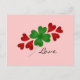 A beautiful design featuring a lucky 4 leaf clover with red hearts and the word "Love" on a pink background on this post card.