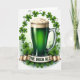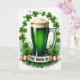 This card features a tall glass of emerald-green ale at the center, catching soft highlights that make it look cool and freshly poured 💚. A thick white foam cap spills gently over the rim, and tiny bubbles rise through the green drink like a quiet toast between friends. Around the glass, a wreath of three-leaf shamrocks forms a natural frame, with curving vines linking each clover in a way that feels like an easy arm-in-arm embrace ☘️. The shamrocks are shaded with light and shadow to give them depth against the bright white background. Beneath the mug, a golden banner stretches across the lower portion, adding a warm contrast to all the green. On the banner, the words “THE IRISH ALE” sit centered in dark serif letters that stand out clearly. The mug’s handle has a gleaming metallic look, and the banner’s folds show gentle highlights and shadows along its edges.