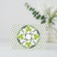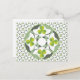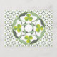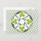 This postcard features a Celtic inspired pattern of interlocking curved shapes in muted green hues is interspersed with brighter green shamrocks or three leaf clovers along with a larger version of the motif and clover shapes that symbolise St. Patrick’s Day and the Holy Trinity.