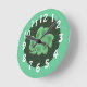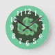Shamrock or clover (shaded) in centre of clock, with textured dark green centre background, and green outer background. With white numbers. Outer background and numbers are subject to colour change by you.