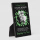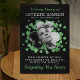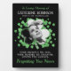 Irish themed memorial photo plaque featuring a picture of your lost loved one in the shape of a shamrock, a scattering of green clovers, the text "in loving memory", their name, birth/death dates, and the remembrance saying "your presence we miss, your memory we treasure, loving you always, forgetting you never".