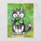 A black and white cat holding a three-leafed shamrock in his mouth, for St. Patrick's Day, or just for fun!