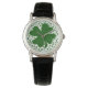 Women’s classic black leather strap watch with an image of a dark green shamrock on a background of tiny shamrocks and top hats on white. See matching square charm. See the entire St. Patrick's Day Watch collection under the ACCESSORIES category in the HOLIDAYS section.